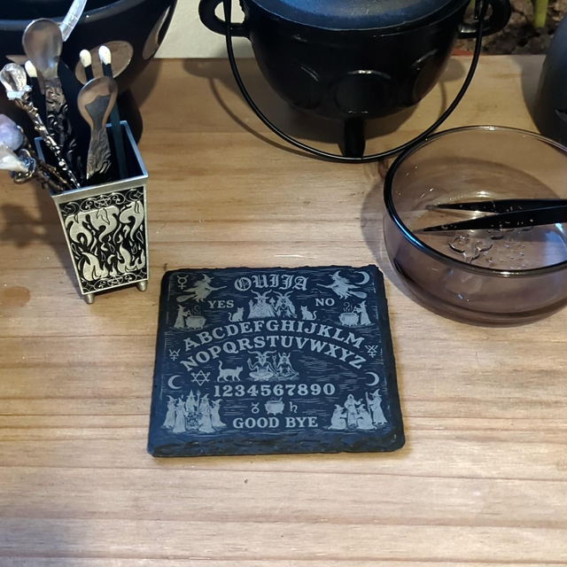 Embrace the mystical with this intricately detailed slate coaster, featuring a classic spirit board design. Laser-engraved with precision, the artwork showcases traditional Ouija elements alongside occult iconography, including Baphomet, soaring witches, and celestial symbols.